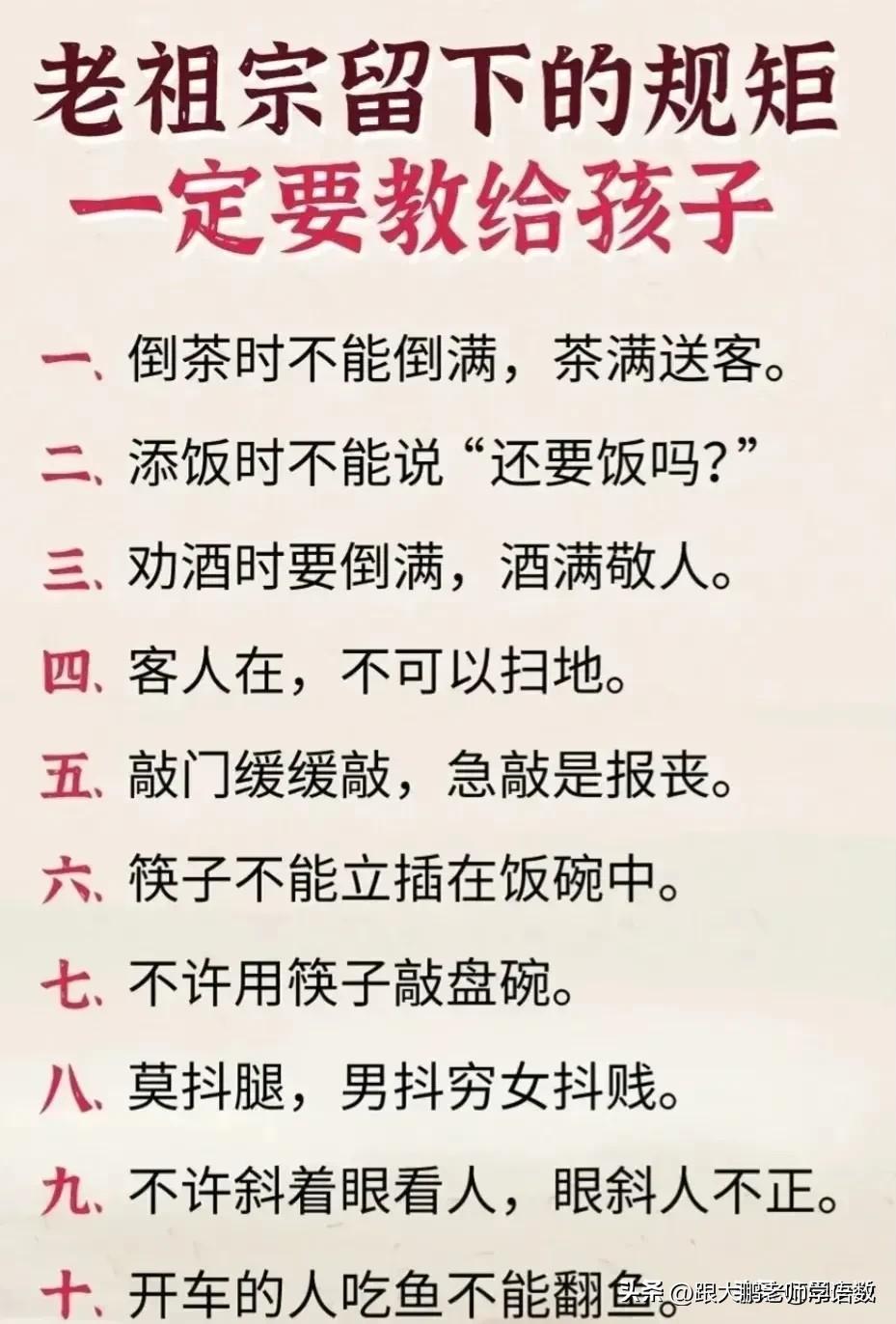 我的天啊,终于搞清楚了原来老祖宗留下的这些规矩这么有讲究!最近看到一张图片,上面列出了十条传统礼仪规矩,这些都是我们中华文化的精髓,值得我们传承和教育给下一代。倒茶时不能倒满,这是为了避免茶水溢出,表示对客人的尊重。添饭时不能说“还要饭吗?”,这句话可能会让客人感到尴尬,应该用更委婉的方式询问。劝酒时要倒满,这是表示对客人的敬意。而客人在的时候,不可以扫地,以免给客人造成不受欢迎的感觉。敲门要缓缓敲,急敲通常用于报丧,这是对生命的尊重。筷子不能立插在饭碗中,这会让人联想到祭祀,不太吉利。不许用筷子敲盘碗,这是对食物的尊重。莫抖腿,这不仅是礼貌问题,还有“男抖穷女抖贱”的说法,虽然有些迷信短线股票推荐,但保持端庄总是好的。不许斜着眼看人,这是对他人的尊重,眼斜可能会给人不诚实的印象。最后,开车的人吃鱼不能翻鱼,这可能是因为翻鱼的动作在开车时不安全,也寓意着平安。这些规矩虽然有些可能随着时代的发展而有所变化,但它们背后蕴含的尊重、礼貌和传统文化的价值是永恒的。让我们把这些规矩教给孩子们,让他们在成长的过程中,学会如何成为一个有教养、懂礼仪的人。